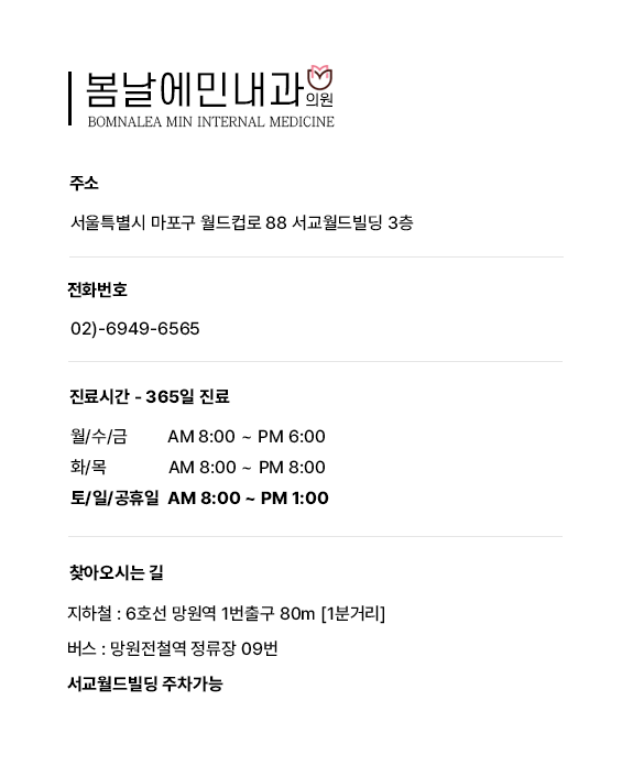 봄날에민내과의원 ㅣ 대표자 김보민 ㅣ 사업자등록번호 616-94-12426 ㅣ 문의 02-6949-6565